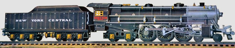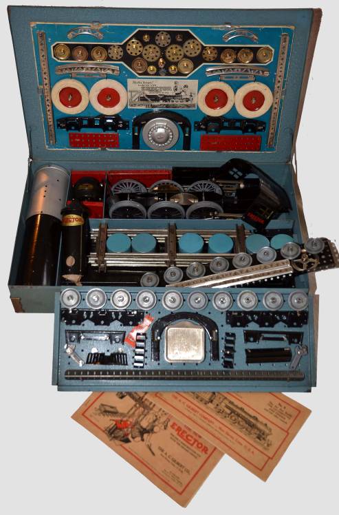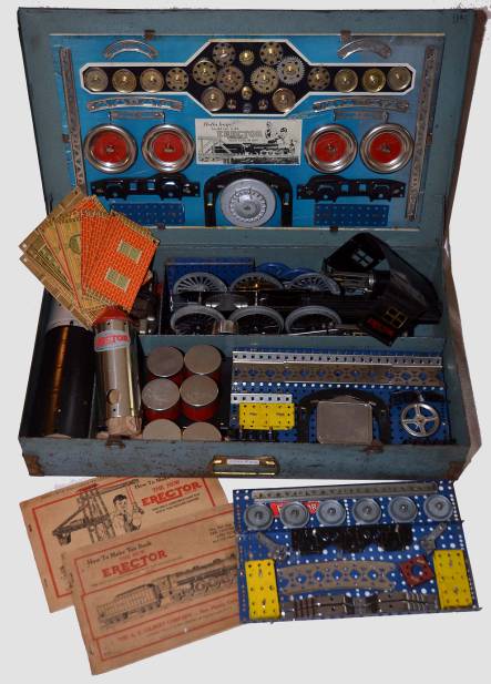 Builds the 4-ft Locomotive and Tender and other models that will make your blood tingle. Contains Skyscraper Panels and Rivets to build architectural models. Powder blue box with crackle finish, two motors, 1,132 parts…$4,500.00