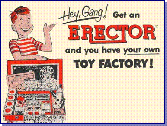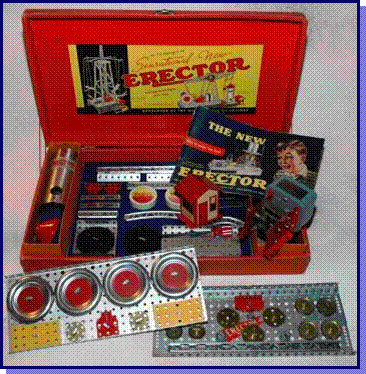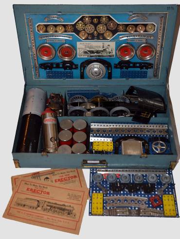 Contains Reversing Electric Engine (P-51) and battery Motor (P-58). Builds the Giant 4-ft Locomotive and Tender and all other Erector models. Two How-To-Make-‘Em books. Packed in Powder blue box with crackle finish…$4,850.00